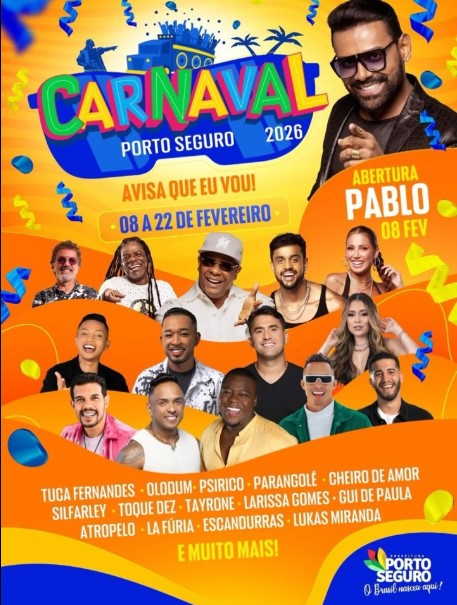 Porto Seguro já está em contagem regressiva para viver mais uma edição inesquecível do seu tradicional Carnaval. Com o tema “Avisa que eu vou”, a festa começa oficialmente neste domingo, 8 de fevereiro, com um grande show do Rei do Arrocha, Pablo, na Passarela da Cultura, um dos principais palcos da folia na cidade. A programação segue intensa até o dia 22 de fevereiro, reunindo uma verdadeira constelação de artistas e atrações que prometem agradar todos os públicos.