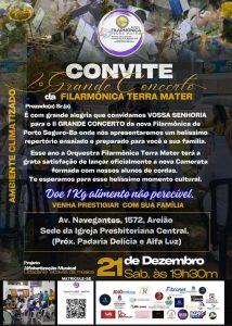 No dia seguinte, 21 de dezembro, a Filarmônica Terra Mater apresenta o grande Concerto com o tema “Tradições Musicais”, que acontece a partir das 19h30m no Salão Principal da Igreja Presbiteriana Central, localizada na Avenida Navegantes, 1572, no bairro Areião. Para participar, o público será convidado a fazer uma contribuição simbólica de 1kg de alimento não perecível, que será destinado a ações sociais da cidade. Este concerto é uma verdadeira imersão nas músicas que refletem as tradições culturais de Porto Seguro e da Bahia, conduzidas pela batuta do maestro Ronald M Filho. A programação promete ser uma experiência emocionante e cheia de energia, com peças que misturam o erudito e o popular.
