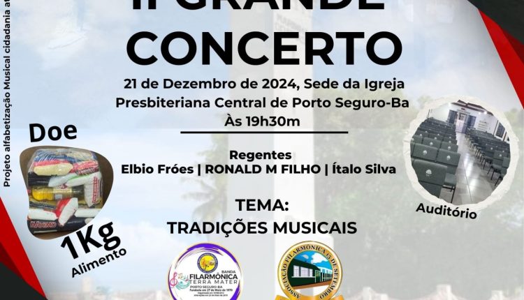 No dia seguinte, 21 de dezembro, a Filarmônica Terra Mater apresenta o grande Concerto com o tema “Tradições Musicais”, que acontece a partir das 19h30m no Salão Principal da Igreja Presbiteriana Central, localizada na Avenida Navegantes, 1572, no bairro Areião. Para participar, o público será convidado a fazer uma contribuição simbólica de 1kg de alimento não perecível, que será destinado a ações sociais da cidade. Este concerto é uma verdadeira imersão nas músicas que refletem as tradições culturais de Porto Seguro e da Bahia, conduzidas pela batuta do maestro Ronald M Filho. A programação promete ser uma experiência emocionante e cheia de energia, com peças que misturam o erudito e o popular.