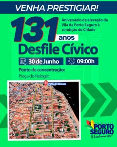 Você, que ama a Terra Mãe do Brasil, é nosso convidado especial para as comemorações dos 131 anos da elevação da Vila de Porto Seguro à condição de Cidade. Vamos juntos promover um belo desfile cívico pelas principais ruas do Centro, em um grande momento de cidadania e civismo.