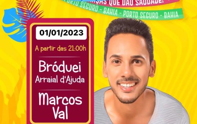 No dia 01 de janeiro de 2023 dando início ao Projeto Verão da Prefeitura Municipal de Porto Seguro, o Cantor Marcos Val se apresentará na Broduei em Arraial D’ Ajuda. Ao longo de seus shows o cantor tem apresentado um repertório animado e dançante agradando a todo público presente. No primeiro dia do ano 2023, com certeza não será diferente, um super show de musicalidade e alegria para turistas e moradores de Arraial D Ajuda.