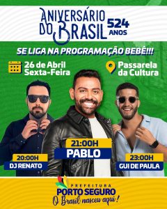 Não perca essa oportunidade de curtir uma noite de muita música e diversão em Porto Seguro. Compareça à Passarela da Cultura nesta sexta-feira e celebre junto com Pablo, DJ Renato e Gui de Paula!