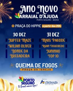 As festividades começarão no sábado, 30 de dezembro. Na Sede, a animação começa com apresentações de Davi Swingado, André Lima & Rafael, e Marcos Val. Em Arraial d’Ajuda, na Praça do Hippie, as atrações incluem Jupter Maze, Wilian Oliver e Bonde da Bregadeira. Já em Trancoso, na Praça da Independência, o palco será tomado pelos sons de Pat Urucungá e Mateus Galvani.