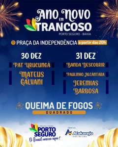 Na noite da virada, 31 de dezembro, além de um fantástico espetáculo pirotécnico, a Passarela da Cultura recebe Paulinho Alcantara, Lennon Bahia e Banda Dengo. Em Arraial, Mais Pagode, Ruan Figueiredo e Juninho Top 10 vão animar a festa. Em Trancoso, a Banda Descobrir, Paulinho Alcântara e Jeremias Barbosa vão agitar o público.