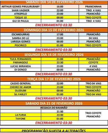 A ansiedade acabou. Após meses de expectativa, foi finalmente divulgada a programação com as datas e horários das apresentações do Carnaval na Passarela da Cultura, em Porto Seguro. Embora a relação das atrações musicais já fosse conhecida há algum tempo, o público ainda aguardava a confirmação de quando cada artista subiria ao palco. A definição foi anunciada e já começa neste sábado, 14 de fevereiro, prometendo agitar moradores e turistas com muita música e animação.