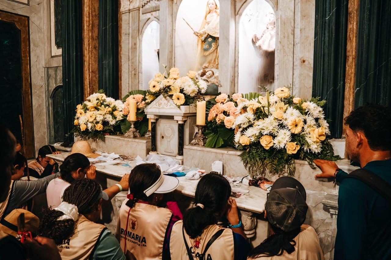 Seguindo até o distrito de Arraial d’Ajuda, os peregrinos foram acolhidos no Santuário de Nossa Senhora d’Ajuda, o primeiro santuário mariano do Brasil, erguido em 1549. O momento marca os festejos em homenagem à padroeira, que incluem missas, novenas e a procissão solene, reunindo moradores e visitantes em um dos mais importantes eventos de turismo religioso do país.