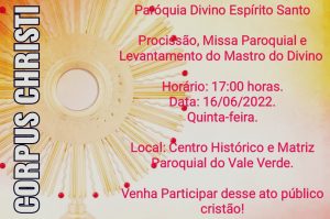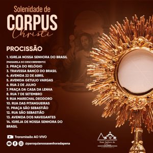 A Paróquia Nossa Senhora da Pena, realiza nesta Quinta-feira (16/06) a Solenidade de Corpus Christi 2022, a partir das 08h (Sem Procissão) e as 15h com a Grande Procissão, ambas realizadas na Igreja Nossa Senhora do Brasil – Passarela do Descobrimento, com Transmissão AO VIVO pelas Redes Sociais,