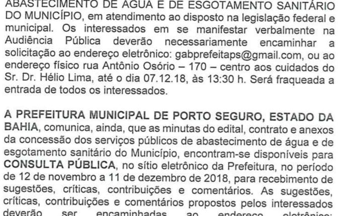 Em mais um procedimento inusitado, a convocação da audiência pública para discutir a minuta do edital de concessão dos serviços de fornecimento de água em Porto Seguro, determina que para se manifestar, opinar ou formular proposições no evento, é necessário a inscrição antecipada em site disponibilizado pela prefeitura.