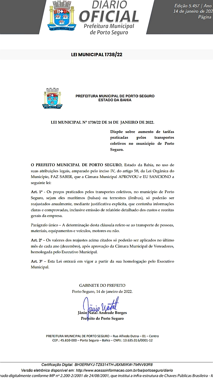 O prefeito Jânio Natal enviou para a Câmara Municipal de Vereadores de Porto Seguro, Projeto de Lei nº 053/2021 que dispões sobre o aumento de tarifas praticadas pelos transportes coletivos no município de Porto Seguro.