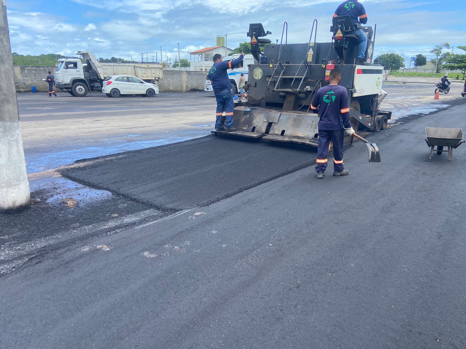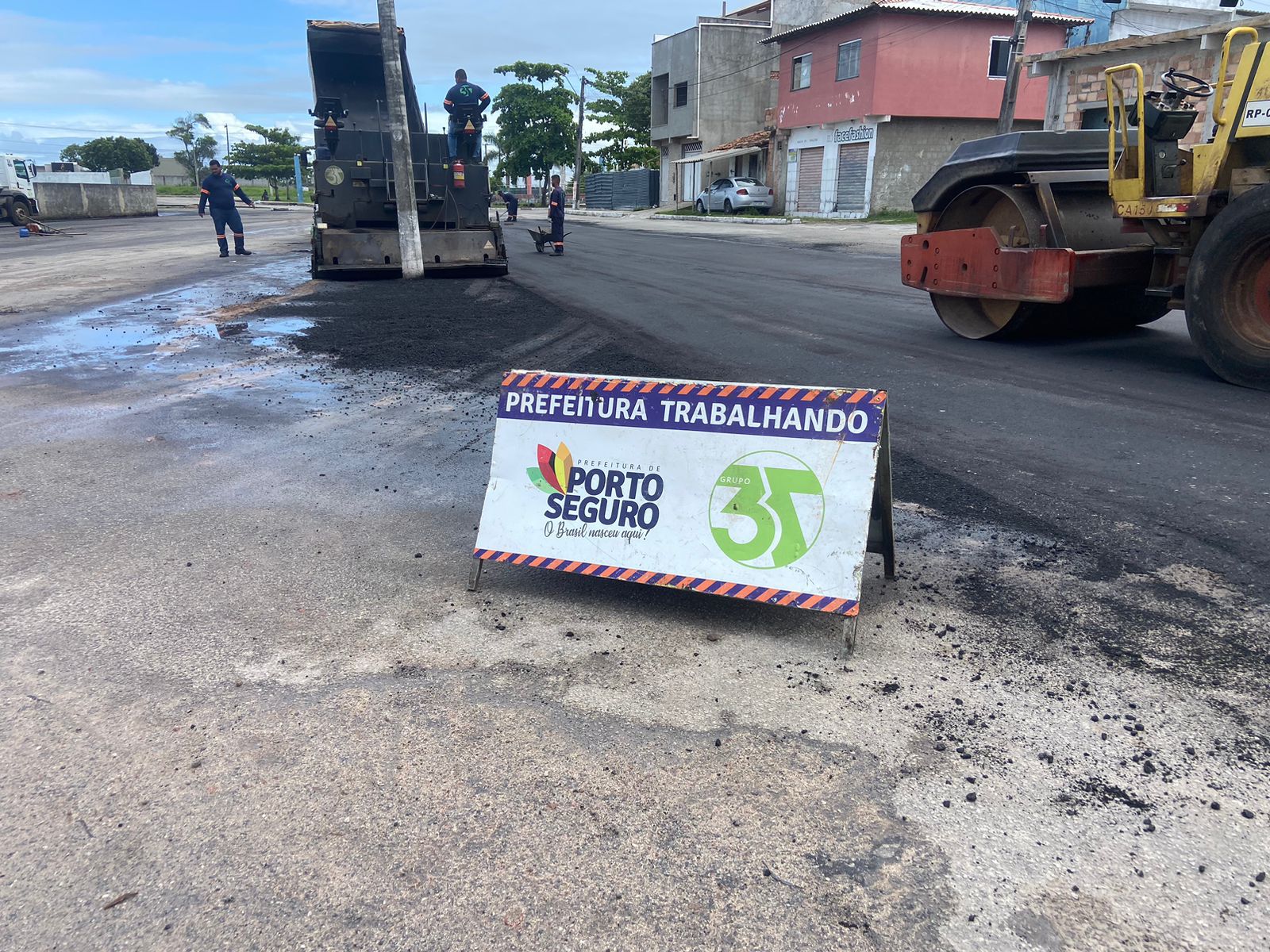 Em pleno Carnaval, as equipes de infraestrutura da Prefeitura de Porto Seguro estão trabalhando no asfaltamento do entorno da Praça do Trabalhador, no bairro Mercado do Povo, Complexo Baianão.