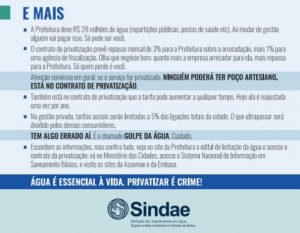 -Você sabia que a prefeitura deve 28 milhões de reais (repartições públicas, postos de saúde etc.) e com a privatização do serviço, você é quem vai pagar essa conta!