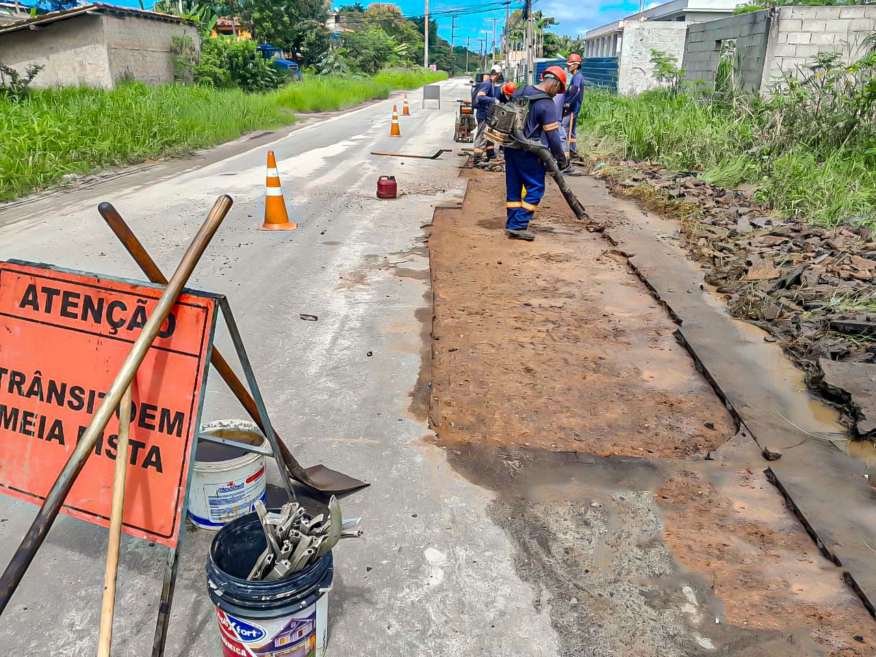 Na mesma frente de trabalho, está sendo feito o conserto do solo saturado na lateral da pista, reforçando a qualidade da serviço prestado.