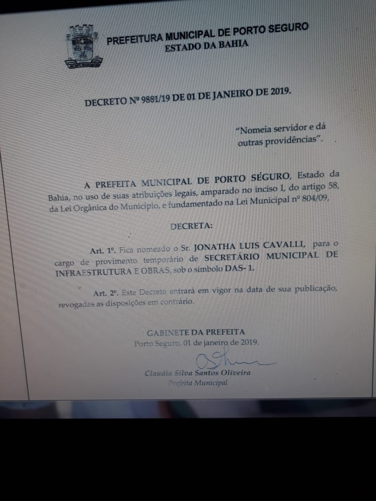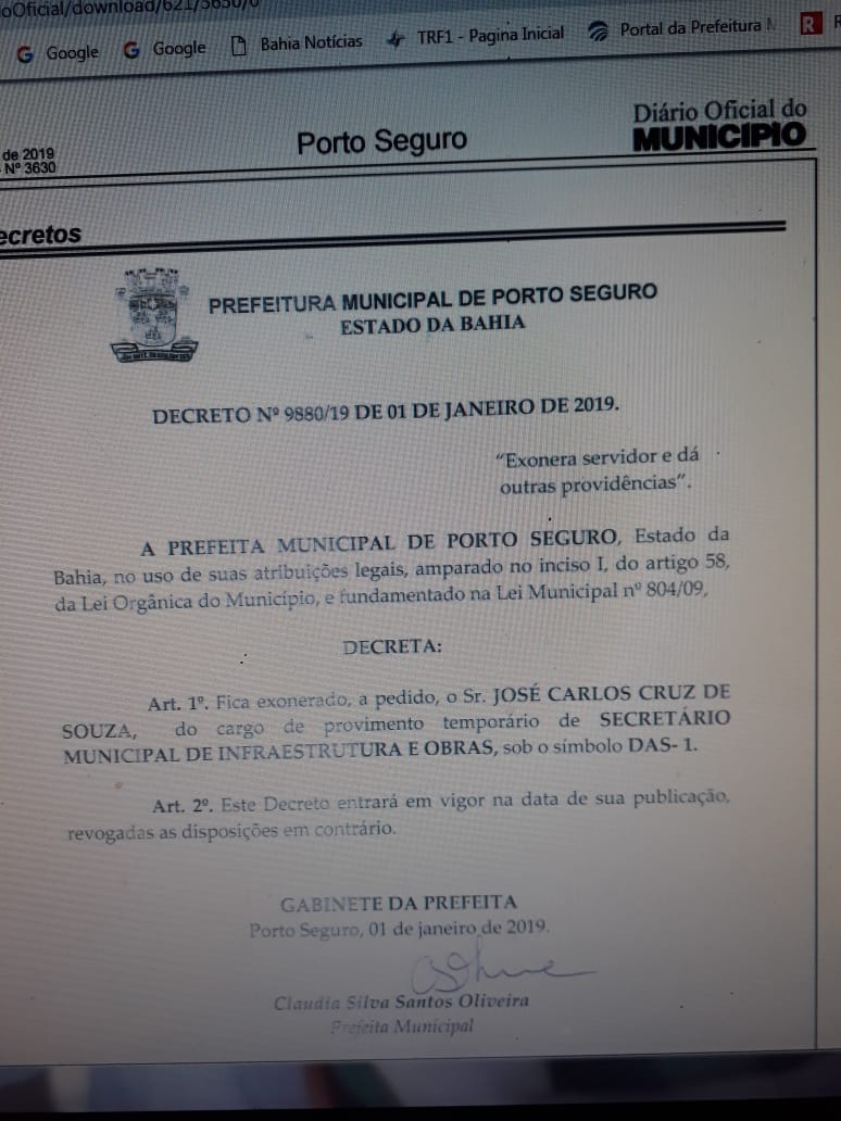 O Diário Oficial do município de Porto Seguro publicou na terça-feira, 01/01/2019, decreto da Prefeita Cláudia Oliveira (PSD) exonerando do cargo o secretário de Obras e Infraestrutura do município, Jose Carlos Cruz de Souza.