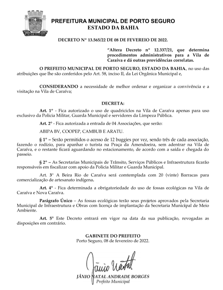 O prefeito Municipal de Porto Seguro, Jânio Natal, num gesto de compreensão e disposição ao diálogo, editou nesta terça-feira, (08/02), decreto municipal nº 13 565/22, alterando decreto anterior, que determina procedimentos administrativos para a Vila de Caraiva, distrito de Porto Seguro.
