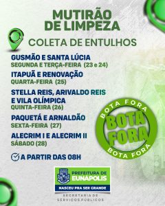 “Solicitamos à população que se programe para descartar os lixos de maior volume durante o mutirão, contribuindo para a limpeza da nossa cidade e para a saúde dos eunapolitanos”, destacou o secretário de Serviços Públicos, Carlos Alberto Ferreira.