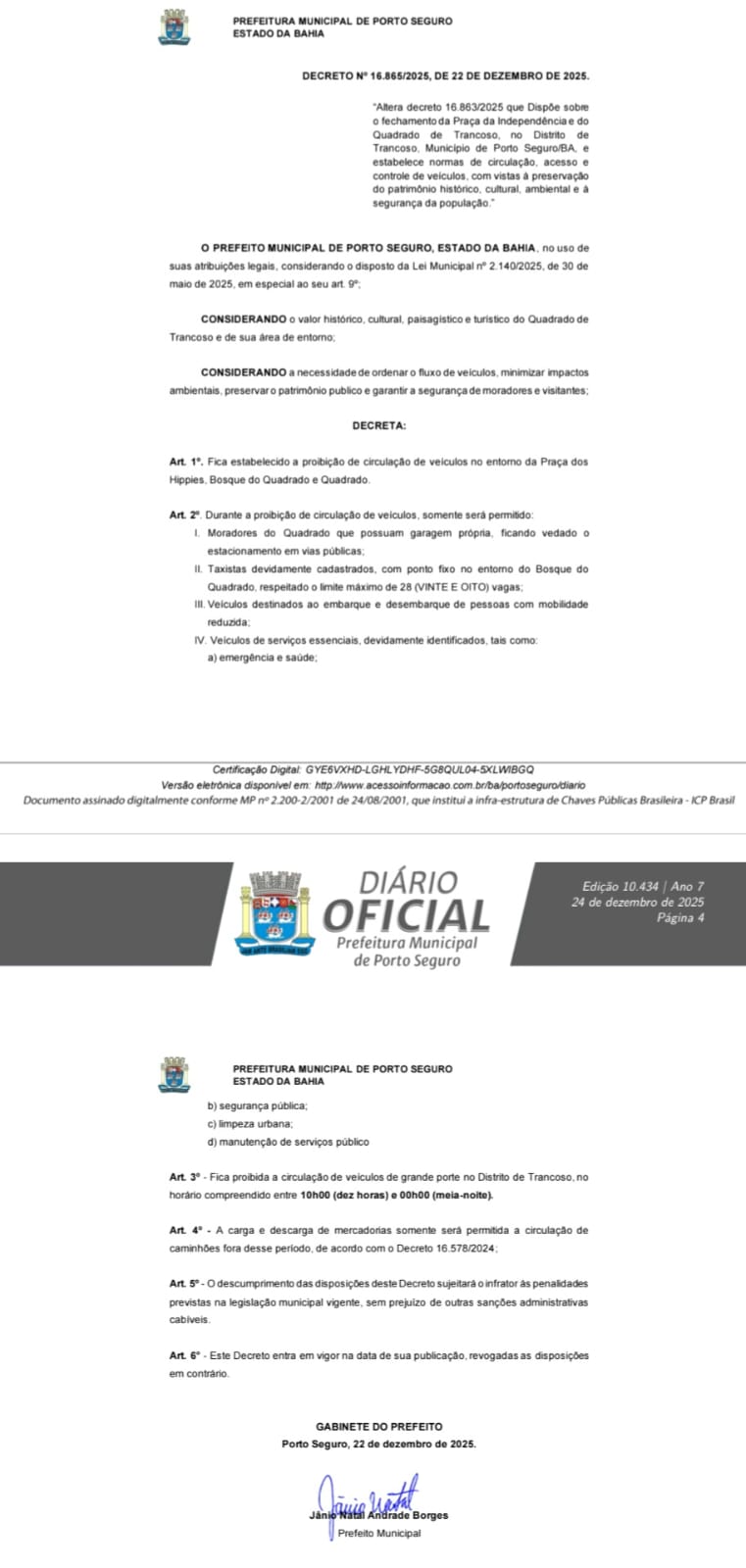 A Prefeitura Municipal de Porto Seguro publicou decretos que passam a disciplinar o estacionamento de veículos em áreas de lazer e em espaços de reconhecido valor histórico, cultural e ambiental do município. As medidas atingem pontos sensíveis e de grande circulação, como rotatórias, áreas de convivência e locais de memória, a exemplo do tradicional Quadrado de Trancoso, um dos principais cartões-postais da cidade.