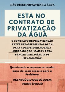 Para finalizar, lembro aos contribuintes locais que: os contratos de privatização desses serviços, normalmente preveem repasse mensal de 3% para a prefeitura sobre a arrecadação e mais 1% para bancar uma agência de fiscalização. Ou seja: quanto mais a empresa arrecadar para ela, mais repasse para a prefeitura. Um negócio que só quem perde é você.