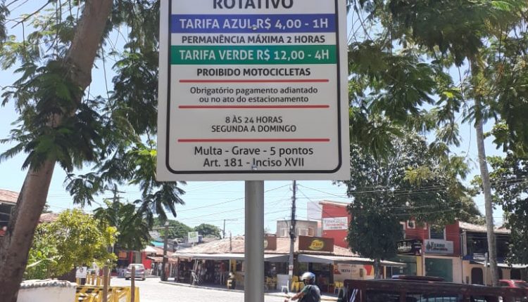 O distrito de Arraial D’ajuda, em Porto Seguro, amanheceu neste domingo, 09/02, sinalizado com placas verticais, alertando para a cobrança de estacionamento denominado “zona azul”, na maior parte das ruas e logradouros da região central do distrito.