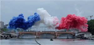 Esse mascarado foi, a partir daí, o condutor da chama e do espetáculo, que ganhou ares de contos de fada a partir do momento em que seu barco passou por baixo da Ponte de Austerlitz, que explodiu em um espetáculo de fumaça vermelha, azul e branca, cores da bandeira da França.