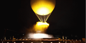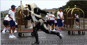 Esse mascarado foi, a partir daí, o condutor da chama e do espetáculo, que ganhou ares de contos de fada a partir do momento em que seu barco passou por baixo da Ponte de Austerlitz, que explodiu em um espetáculo de fumaça vermelha, azul e branca, cores da bandeira da França.