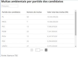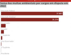 Cerca de 30% das 392 infrações aplicadas pelo Ibama estão concentradas em três estados pelos quais os candidatos concorrem este ano: Mato Grosso (16,5%), Rondônia (8,4%) e Roraima (7,3%). O cruzamento entre o total de multas e os partidos dos candidatos indica que o PL, partido do presidente Jair Bolsonaro, concentra a maior quantidade de multas (58) e a maior soma R$ 19 milhões. Abaixo do PP, vem o PROS, com apenas sete infrações, mas que somam R$ R$ 15 milhões.