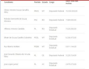 Na lista dos políticos multados constam candidatos a deputado federal e estadual, senador e governadores.