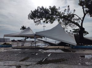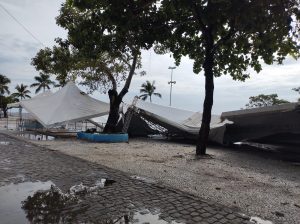 Até o momento, não há informações de desabamentos, queda de árvores, alagamentos e destelhamentos, a não ser a queda de estruturas de toldos montados na Passarela do Descobrimento, no centro da cidade