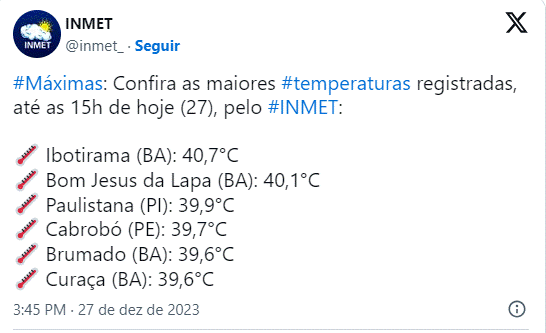Outras três cidades baianas também apareceram na lista. Bom Jesus da Lapa registrou 40,5ºC, Curaça, 40ºC, e Brumado, 39,9ºC. (os dados abaixo foram divulgados antes das máximas terem sido atingidas nas cidades – o Inmet divulga sempre a parcial medida às 15h)