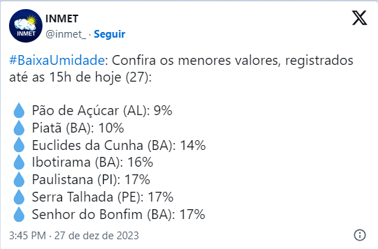 Na segunda-feira (25/12), o índice foi de apenas 7% na localidade, e de 11% nesta terça (27/12). Euclides da Cunha (14%), Ibotirama (16%) e Senhor do Bonfim (17%) também apareceram na parcial do Inmet.