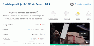 Nos últimos dias, o município de Porto Seguro tem sido alvo de chuvas frequentes e ininterruptas, que, embora de intensidade reduzida, já encharcaram significativamente o solo na região. A previsão dos Institutos de Meteorologia indica que as chuvas devem continuar até o final do fim de semana, o que preocupa as autoridades locais. Segundo o Climatempo a previsão do tempo para hoje é de temperatura entre 22º e 26º e com forte possibilidade de chuva. Para o mês de outubro a média mensal de chuva é de 106mm na cidade. Até o dia 17 já choveu 13mm em Porto Seguro no mês de outubro de 2024, o que representa 12% da média normal para o mês.