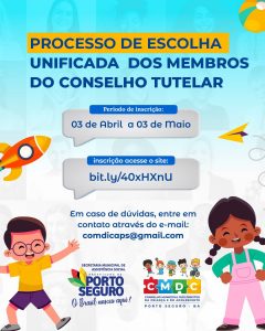 O Conselho Municipal dos Direitos da Criança e do Adolescente de Porto Seguro (Comdica) publicou edital para realização do processo seletivo de nível médio para contratação de membros do Conselho Tutelar de Porto Seguro. No total, são 15 vagas para titulares e 15 para os respectivos suplentes.