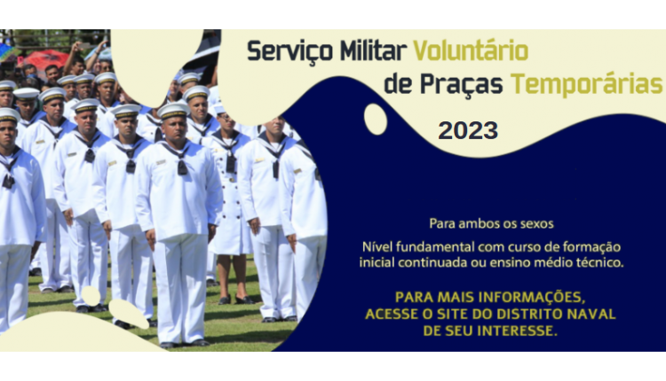 Estarão abertas do dia 14 a 29 de janeiro de 2023, as inscrições no processo seletivo de admissão ao Serviço Militar Voluntário de Praças da Marinha, na área de jurisdição do Comando do Segundo Distrito Naval, para 2023.
