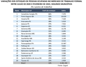 O trabalho da entidade levou em consideração as 667 cidades brasileiras com pelo menos 10 mil trabalhadores formais e foi baseado no Cadastro Geral de Empregados e Desempregados (Caged) do Ministério do Trabalho entre julho de 2020 e fevereiro de 2022.
