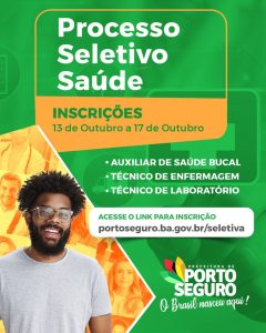 A administração municipal de Porto Seguro divulgou nesta quinta-feira, (13/10) abertura de inscrições para contratação de profissionais na área de saúde