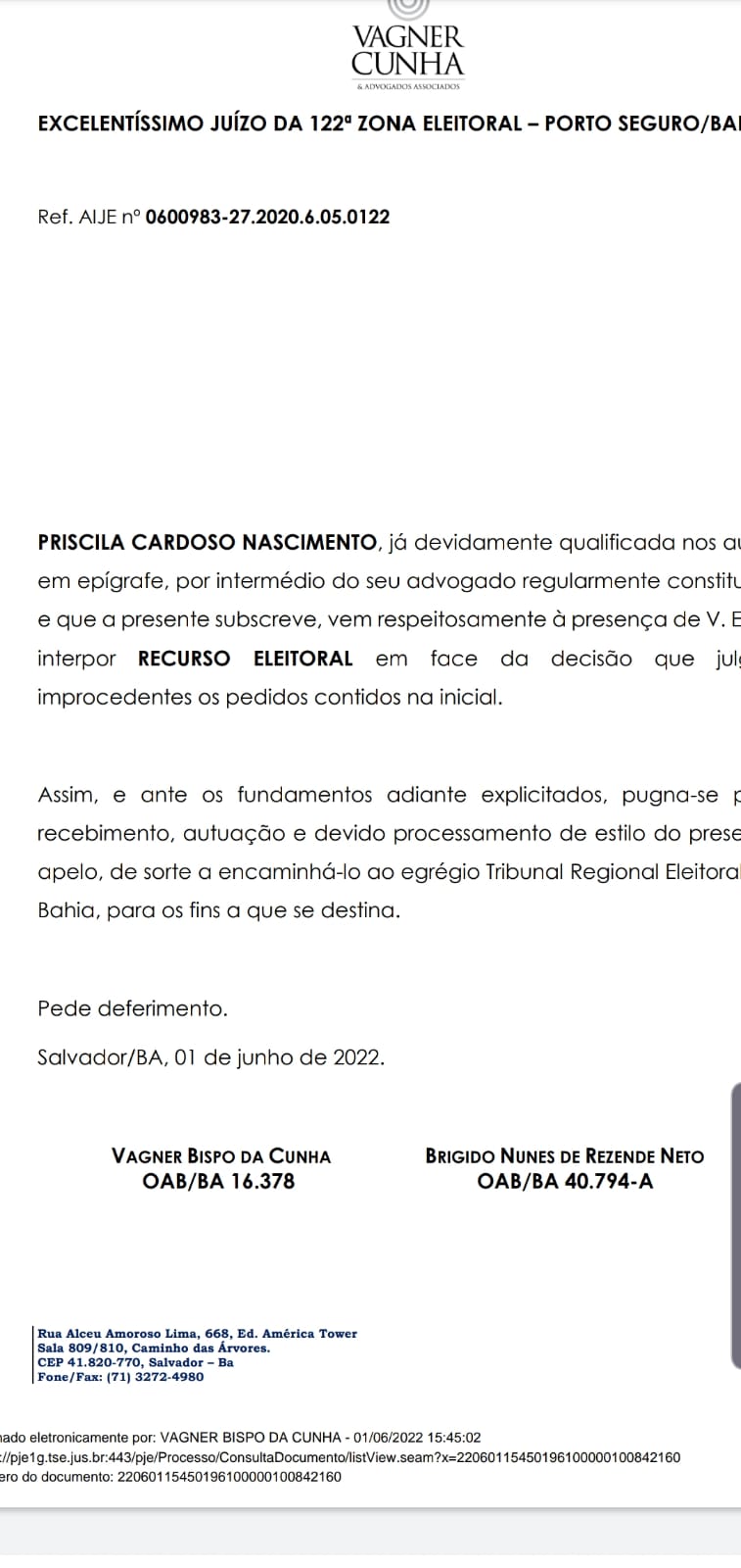 Nesta quarta-feira, (01/06/22) os advogados protocolaram na 122ª Zona Eleitoral de Porto Seguro “Recurso Eleitoral” em face da decisão que julgou improcedente os pedidos contidos na inicial.