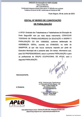 O Sindicato dos Trabalhadores na Educação de Porto Seguro divulgou edital na quarta-feira, (7/06) convocando uma paralisação para a próxima terça-feira (13/06). Segundo o edital, a deliberação pela paralisação foi definida em Assembleia Geral da categoria ocorrida na última quarta-feira, em razão da ausência de diálogo com as autoridades do município.
