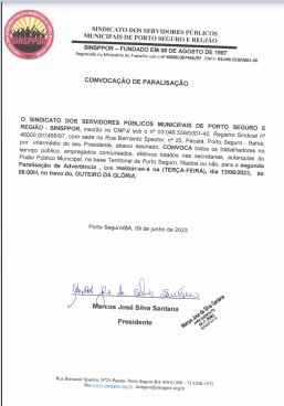 Também para a mesma data (13/06), o Sindicato dos Servidores Públicos Municipais de Porto Seguro e Região (SINSPPOR) divulgou uma Convocação de Paralisação, com concentração, a partir das 8h:00, no Trevo do Outeiro da Glória.