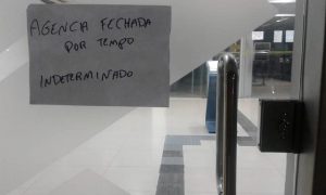 Os dizeres de um cartaz fixado no vidro da agência diz que não há previsão de funcionamento.