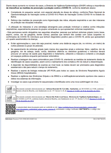 A gravidade desse cenário requer atenção redobrada por parte de todos os cidadãos. É fundamental que a população mantenha a disciplina no cumprimento das medidas de prevenção, buscando reduzir a circulação do vírus e evitar novos contágios. A pandemia ainda não acabou, e é importante termos em mente que cada indivíduo tem um papel crucial na contenção da propagação da doença.