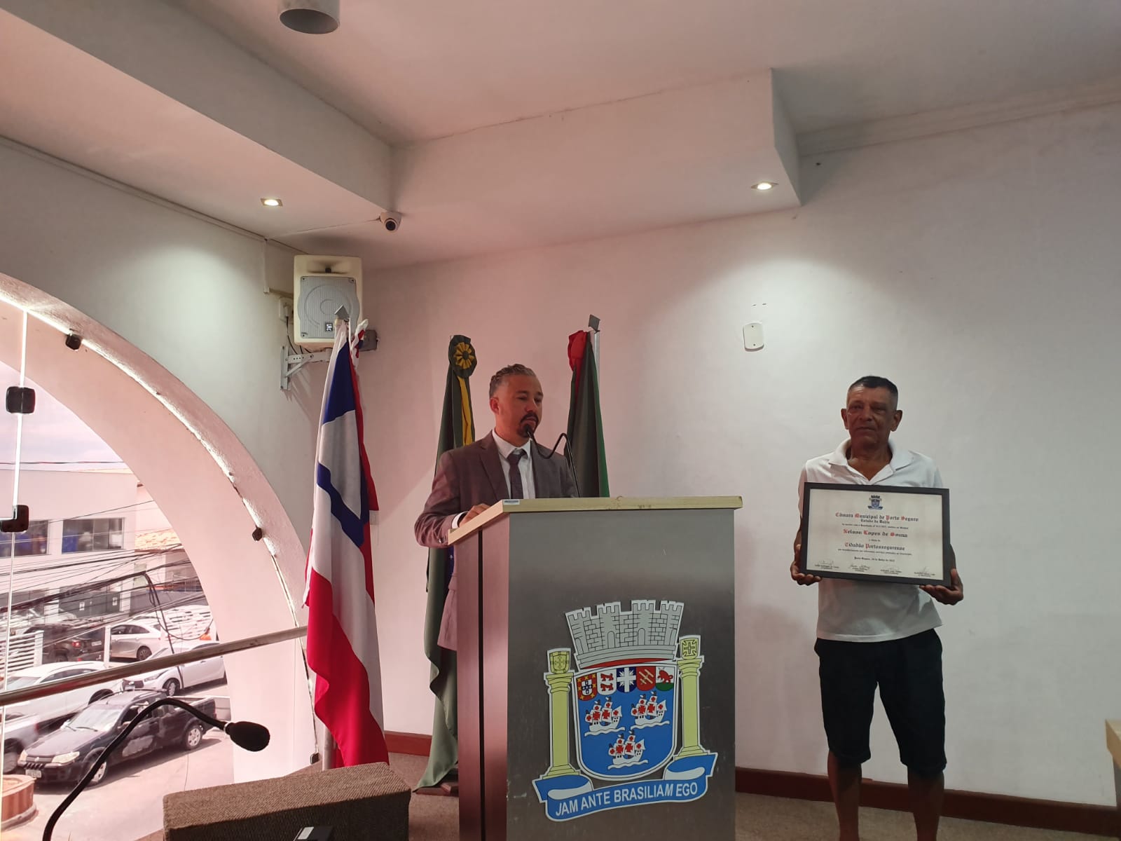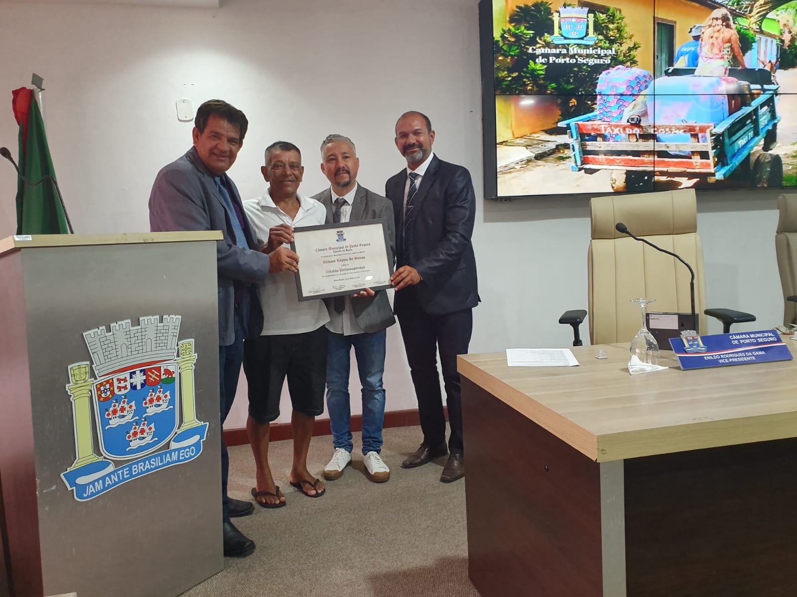 Além disso, um momento especial ocorreu na mesma sessão, quando o batalhador e conhecido vendedor de cachorro-quente, Nelson Silva, foi homenageado com o título de Cidadão Honorário de Porto Seguro. “Foi um tributo merecido a uma pessoa que dedica seu tempo e esforço para servir a comunidade” disse o autor do projeto, vereador Bolinha.