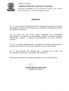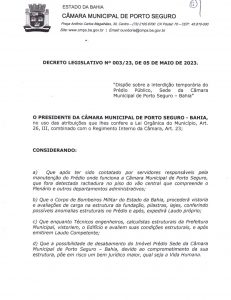 Após os acontecimentos de ontem, quinta-feira, (4/05), quando um estrondo apavorante, decorrente de um rebaixamento de laje, durante a sessão, que, inclusive, provocou a suspensão da sessão, o presidente da Casa editou nesta sexta-feira, (5/05), Decreto Legislativo Nº 003/2023 que dispõe sobre a interdição temporária do prédio, situado na Av. Pero Vaz de Caminha, no Centro da cidade de Porto Seguro.
