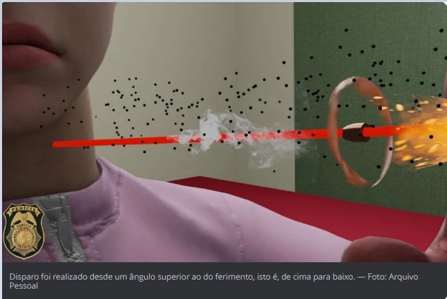 • Segundo o perito forense, o disparo que atingiu a vítima na região do pescoço provocou uma “zona de tatuagem”, na parte de baixo da cabeça. Isto, conforme o documento, significa que ao ser deflagrado à curta distância da vítima, o projétil provocou a saída de gases e resíduos expelidos pelo cano da arma.