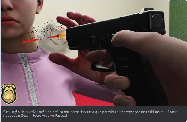 • Segundo o documento, os vestígios podem indicar que a vítima tentou segurar a arma para evitar ser disparada ou posicionou as mãos perto do cano.