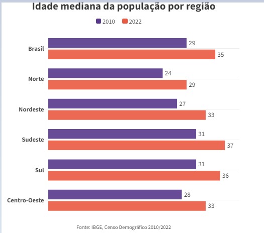 O aumento da idade mediana ocorreu em todas as regiões do país. A região de maior idade mediana em 2022 é o Sudeste, com 37 anos, e a menor a Norte, com 29.