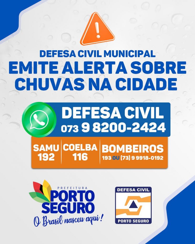Devido ao alerta importante emitido pelo Instituto Nacional de Meteorologia (Inmet) para a região Sul da Bahia, a Defesa Civil Municipal, informa que, desde segunda-feira, 28, está mobilizada e preparada para atender às ocorrências.