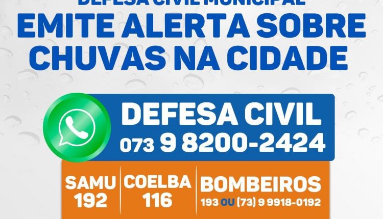 Devido ao alerta importante emitido pelo Instituto Nacional de Meteorologia (Inmet) para a região Sul da Bahia, a Defesa Civil Municipal, informa que, desde segunda-feira, 28, está mobilizada e preparada para atender às ocorrências.