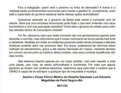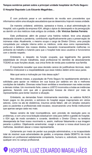 O HDLEM perde muito com a saída do Dr. Vinícius Santos Ferreira. Perde sua competência, sua dedicação e sua liderança, elementos fundamentais para o desenvolvimento do hospital e para a oferta de um atendimento de qualidade. É esperado que o IGH reconsidere sua decisão e reestabeleça a confiança e o respeito dentro do corpo clínico, valorizando e reconhecendo o trabalho dos profissionais que são tão importantes para a saúde da população de Porto Seguro.