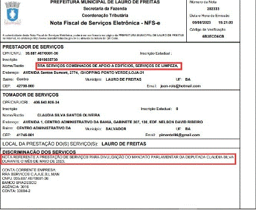 A deputada estadual Cláudia Oliveira (PSD) pagou mais de R$ 58 mil para que uma empresa de limpeza de Lauro de Freitas prestasse serviço de marketing ao mandato, entre o primeiro semestre de 2023 e 2024. Pelo menos é o que consta na aba Transparência, do site da Assembleia Legislativa da Bahia (AL-BA).