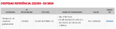 Em junho de 2023, o mandato da social-democrata efetuou um pagamento de R$ 10 mil, referente ao mês de abril, e outro de R$ 15 mil, referente ao mês de maio à empresa RRA Servicos Combinados de Apoio a Edificios, Servicos de Limpeza, Manutenção e Locação de Veículos LTDA. A empresa, cujo nome fantasia é OWL Service, está ativa na Receita Federal desde dezembro de 2019. Em fevereiro e março de 2024, os pagamentos foram de R$ 19,3 mil e R$ 13,8 mil, respectivamente, totalizando R$ 58,1 mil.