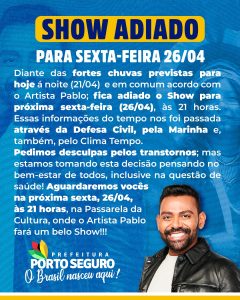A previsão de fortes chuvas para este domingo, (21/04), motivou o adiamento do show do cantor Pablo, ícone da “sofrência”, que aconteceria na Passarela do Descobrimento, na noite deste domingo, (21/04), em Porto Seguro.